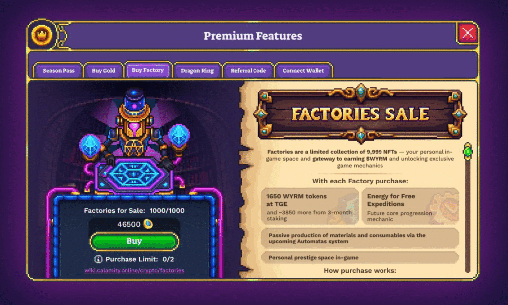 • Tabela de Classificação da Guilda: mede o desempenho coletivo dos membros. Quanto melhor a guilda nas masmorras, mais alto seu ranking – e maiores as chances de conquistar $WYRM tokens.