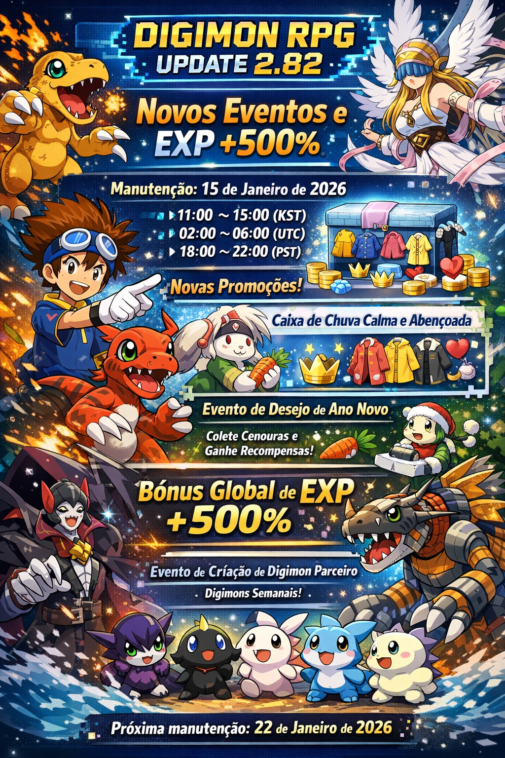 A Administração Digital anunciou oficialmente a chegada da Atualização 2.82 ao Digimon RPG (Servidor NA). A manutenção acontece no dia 15 de janeiro de 2026, trazendo novas promoções na loja, eventos de Ano Novo, ajustes em sistemas internos e um bônus global de EXP de 500% por tempo limitado.