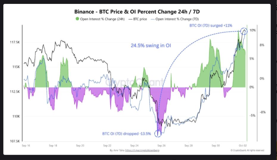 De acordo com Amr Taha, da CryptoQuant, o ponto de virada ocorreu em 25 de setembro, quando o Open Interest (OI) caiu 13,5%, sinalizando capitulação. Desde então, o OI se recuperou 11%, e o Net Taker Volume mostrou compras agressivas de +US$ 1,62 bilhão, confirmando a retomada do controle pelos compradores.