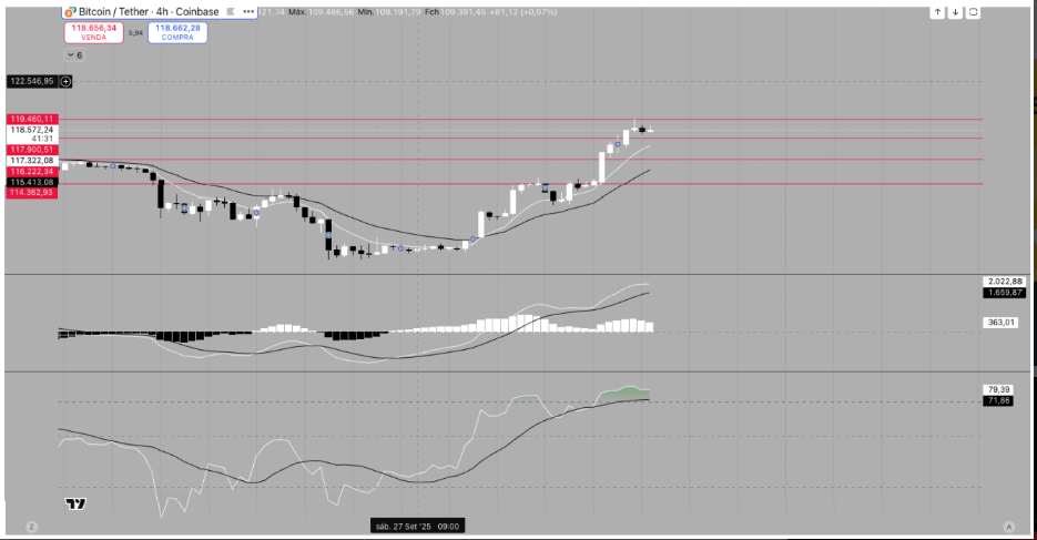 “O movimento de alta desde 25 de setembro já acumula 9,5%. Embora haja sinais de sobrecompra no RSI, a pressão compradora segue forte. Se o BTC não consolidar acima de US$ 119.300, pode corrigir para a região de US$ 117.900 – US$ 114.300 antes de retomar o impulso.”
